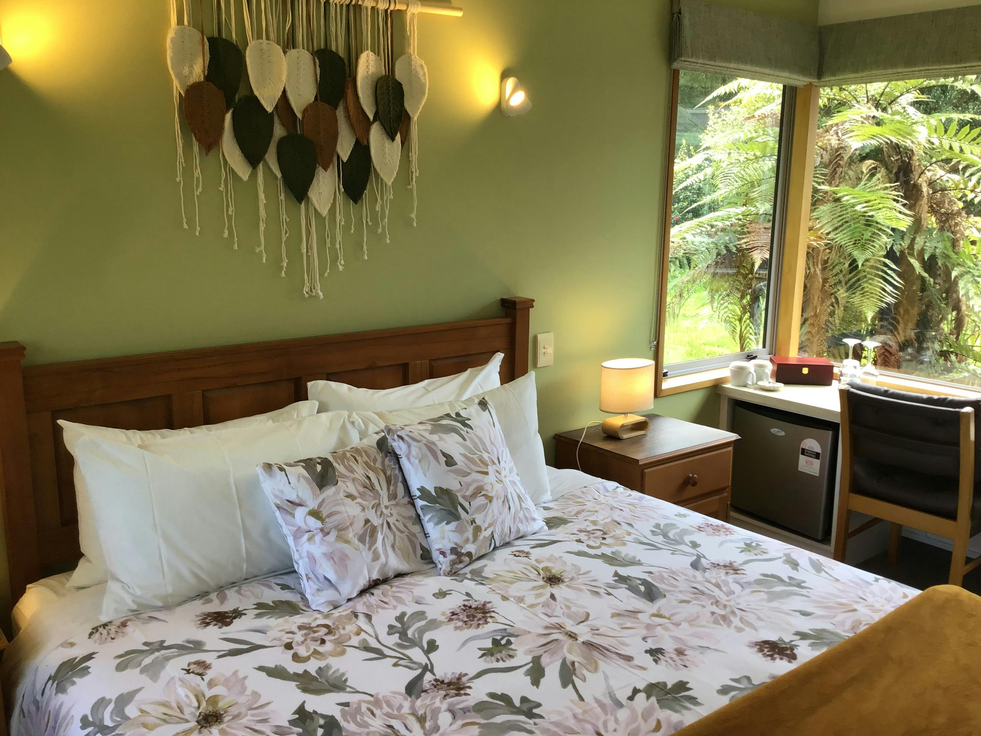 The Mahinapua room has a king bed. The Mahinapua room is partially surrounded by the shrub garden at Woodland Glen Lodge. From across the small lawn take in the special view through the arch towards the kahikatea trees or just enjoy the many camellias in the garden.